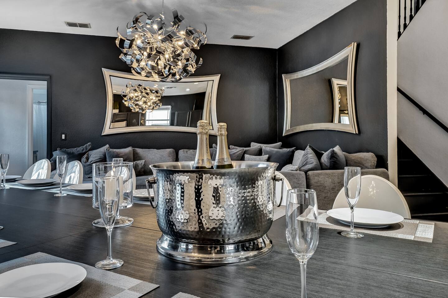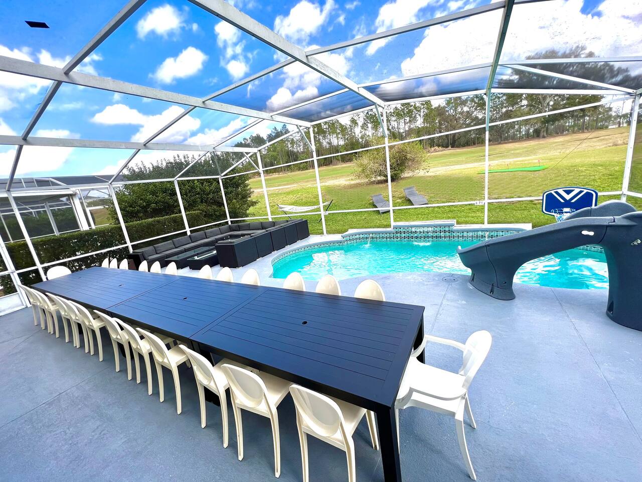 IMPORTANT NOTE: Rate varies/fluctuates depending on number of adults and children staying. Please make sure you enter right estimated number of guests when inquiring. Also if you are on a limited budget please specify budget when inquiries as we have other units that are smaller/less expensive and larger/exclusive which may be more suitable for you. IMPORTANT NOTE: We want to cater to smaller groups where starting published rates are set at up a certain number of guests. Base rate up to a certain number of persons, then additional person rate (rate varies depending on number of persons). The home sleeps maximum of 30 people (max 20 adults with 10 kids). (the rate varies depending on the number of adults/children, season/Holidays/particular events/length of stay, so please inquire with the correct estimated number of persons before making your reservation to confirm correct rate). Once your reservation is made, we have a preferred list of Personal Chefs and Grocery Shopping services available at an additional cost upon request with advance notice. If you require additional housekeeping during your stay, we can arrange it for you at nominal charges. We provide a BBQ grill and a fire pit for your use, both of which run on gas. Please note that you are responsible for delivering the gas. Once the tanks run empty, you can easily refill them at nearby Gas stations, CVS, Walgreens, Walmart, Lowes, and other convenient locations While pool heat is not included in the price, it is available for an additional fee of $45 per day. Please note that pool heat is not necessary from April to October, as the pool normally heats up to 75-80 degrees. If you require pool heating, please make your payment before arrival so we can arrange it for you. It's important to note that a heat pump does not produce heat anywhere near its rated efficiency when it is forced to run during much of the colder nighttime hours (below 70 degrees). Therefore, we do not recommend turning on the pool heat when the outside temperature is below 60 degrees, as the pool will not warm up noticeably. SHEETS, DUVET & BEDDING - We provide 2 Twin size down comforters for a King size bed set up or 1 Twin down comforter for each Twin size bed set up. (1 per person) - We provide 4 pillows for a King size bed set up and 2 pillows for each Twin size bed set up (that is 2 per person) - When a King size bed set up is requested, it consists of 2 Twin bed frames being placed together covered with memory foam and a King size mattress cover. (So, you get the comfortable King size bed experience). - We use duvet sheets that go around each down comforter, which are common in Europe and at most modern hotels. The duvet sheet cover sheets get washed before each guest's arrival. Therefore, we do not use any additional top sheets as the duvet sheet that covers the comforter is the fitted top sheet. NOTE: No non-registered guests and No local visitors are allowed without prior approval at least 14 days before arrival, and no music outside that can be heard more than 60 feet away is allowed (mobile phone only speaker/volume allowed), and completely quiet after 10 pm on weekdays and 11 pm weekends (as in every residential community). Max 4 vans/autos allowed (2 in driveway, 1 on road, and no parking on grass) plus 1 van/auto in guest parking. INQUIRE with US: Look/Search for "Contact Host" on bottom of this page Ask us for possible Lower Price or Larger Home Options Available. Let us know your Dates, Nr People, BUDGET, Nr of BEDROOMS needed • Note that the address in the listing is to community clubhouse/office to secure all guests privacy. Our custom-built villa is styled with comfort, located in the quaint Highlands Reserve Golf Resort in Davenport, only about 9 miles from the Disney World Animal Kingdom area (at Walt Disney YMCA Sherberth). To assure everyone's privacy as we often have famous influencers/influential guests stay with us, villa numbers will be given on arrival check-in day