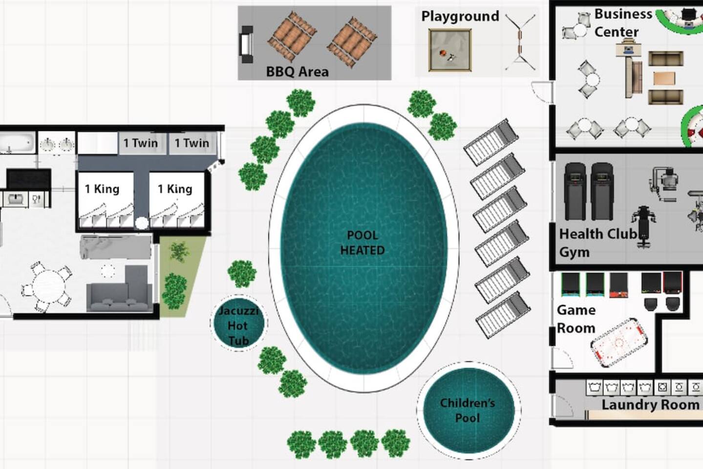 Amenities included: * 1 Swimming Pool * 2 Whirlpool Hot Tub Jacuzzi * BBQ Grill cabana with table with seating * Nespresso Cappuccino Latte Maker * Soda stream - Make Your Own Sparkling Water or Soda * Gym * Game Room * Basketball and Playground * Shared Laundry Room with multiple washers and dryers at nominal fees * Assortment of games on Smart TV * High-speed Wireless Internet * Internet Entertainment w/ 24/7 free movies on our Netflix account * Unlimited Parking right outside the door * 24h security