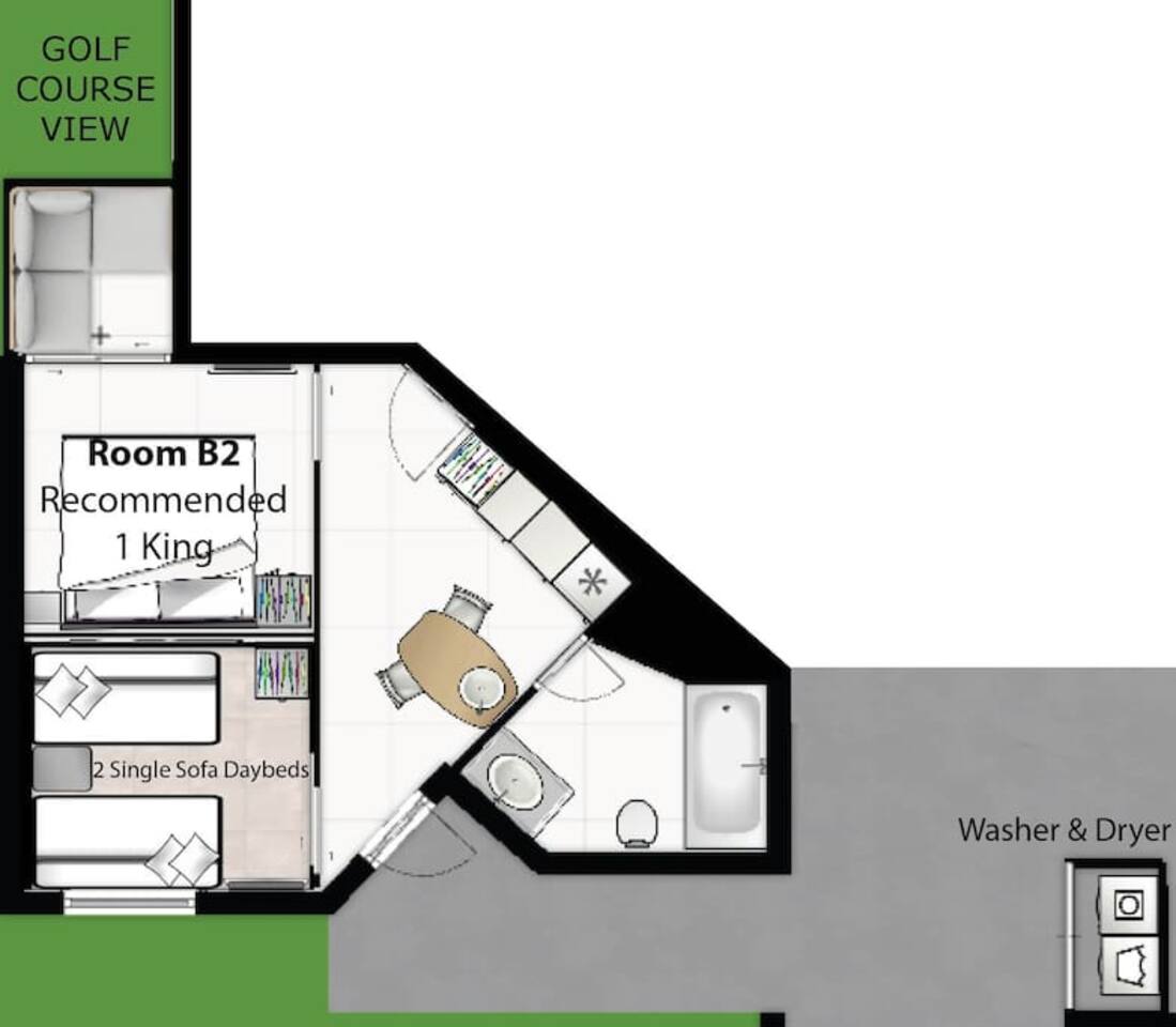 The kitchenette comes with a Porcelain Glass Induction Cook Top, Over-the-counter Convectional Microwave Oven, Fridge-Freezer, Nespresso Machine, Coffeemaker, Toaster, Blender, Pots & Pans, Cooking/eating utensils, Iron, Ironing-board, Ice-Bucket, Wine Glasses, Bar Top with 2 chairs. The living room comes with 2 designer daybed sofas, a table, and a 26-inch Smart TV with Netflix, perfect for relaxing and catching up on your favorite shows after a long day on the golf course or exploring the local area. Bedroom comes with Down Comforters, Memory Foam, Duvet Sheet Covers, and High Thread Count Bed Linen. Whether you prefer large-size beds or individual beds, we've got you covered. The bedroom is fully customizable to suit your needs and preferences. You'll love waking up in the morning feeling refreshed and rejuvenated after a restful night's sleep. Bedroom: 1 King or 2 Single Size Beds, 1 extra Single Bed, 26-Inch Plasma Smart TV with Cable TV, and Closet And let's not forget about the bathroom! It comes complete with high thread count bath linen, ensuring that you'll feel pampered and indulged every time you step out of the shower or bath. Bathroom Nr 1: Shower and Bathtub Combo The cozy patio has a comfy little sofa with table, a Smart TV and is overlooking the Golf Pitch and Putt area. It is the perfect spot to enjoy a cup of coffee or a glass of wine while taking in the stunning views. Whether you're traveling with your family or a friend, this home is the perfect choice for your next vacation. We would love to host you and make your stay with us unforgettable :-) INQUIRE with US: Look/Search for "Contact Host" on bottom of this page Ask us for possible Lower Price or Larger Home Options Available. Let us know your Dates, Nr People, BUDGET, Nr of BEDROOMS needed